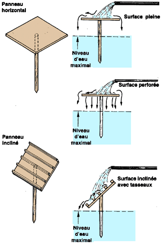 19. Dans un ouvrage précédent (voir manuel 20, Les étangs et leurs ouvrages), vous avez appris comment la plupart des ouvrages de transport et de régulation de l'eau sont construits avec des jeux de rainures qui retiennent des planchettes de bois et des grilles coulissantes. Ce type de grille de filtration est couramment utilisé au niveau des prises d'eau principales, des prises d'eau d'étang, dans les moines et les digues percées, dans les bassins de stockage ainsi que dans diverses structures comme celles qui sont utilisées pour la récolte et le triage du poisson.