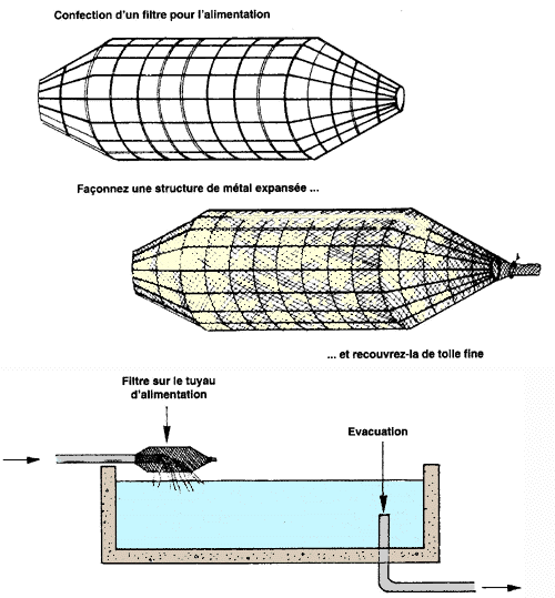 d) L'efficacité de la filtration sera d'autant plus grande que les trous seront petits, mais la grille risque alors de se boucher plus facilement. Pour réduire le besoin de nettoyages fréquents, utilisez des surfaces de filtration plus grandes si les grilles sont fines. Il ne faut pas que les trous soient trop petits.