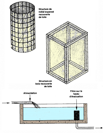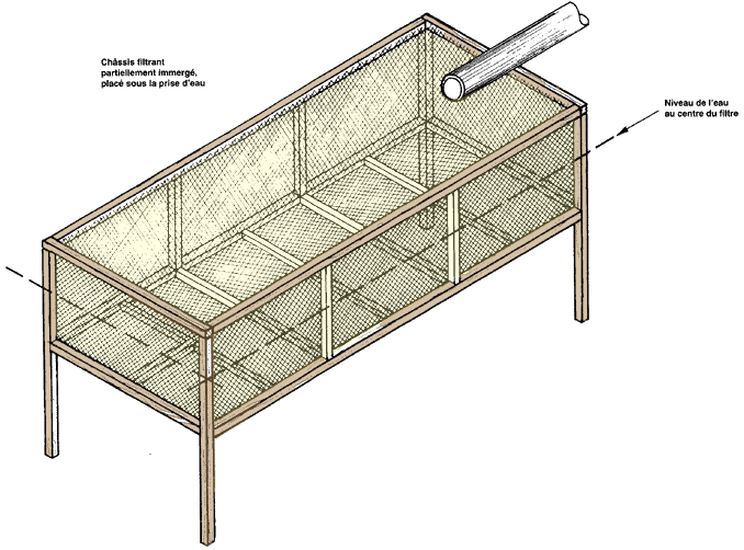 e) Châssis filtrant partiellement immergé: lorsque la distance entre la prise d'eau et la surface de l'eau est faible, vous pouvez utiliser un châssis filtrant immergé à moitié ou aux deux tiers dans l'étang et placé sous la prise d'eau. Fabriquez quatre cadres en bois et assemblez-les en une structure rectangulaire. Renforcez le fond de cette structure de façon que les ouvertures soient inférieures à 35 cm x 60 cm. Tapissez l'intérieur de la structure d'une toile de filtration solide (de préférence un tissu synthétique tel que le saran; voir paragraphe 6 et suivants du présent chapitre). Placez le filtre sous la prise d'eau. Tant que le fond n'est pas immergé, réduisez le débit d'eau, afin d'éviter une pression excessive et une déformation de la toile filtrante ainsi qu'un éventuel débordement.