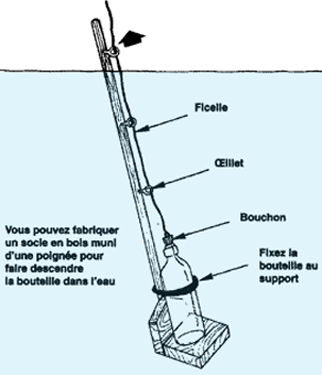 5. Cette méthode est satisfaisante pour les eaux de surface et les eaux peu profondes. Toutefois, pour prélever un échantillon en eau profonde, il faut transformer la bouteille utilisée précédemment en un instrument d'échantillonnage.