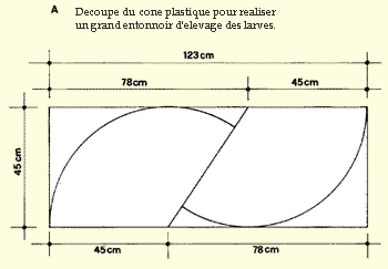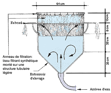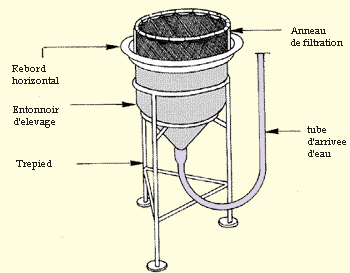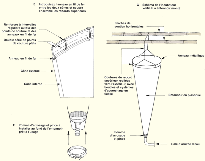 (e) Des dispositifs d'élevage en entonnoir conviennent particulièrement bien pour les larves passives qui restent au fond ou se déplacent peu. Ils peuvent être obtenus auprès d'entreprises spécialisées (jarres d'alevinage) ou être fabriqués sur place à partir de divers types de matériaux, par exemple de tissu, de matière plastique ou de fibre de verre (voir paragraphes 7 à 9). Faites bien attention à deux points particulièrement importants pour l'élevage des larves: