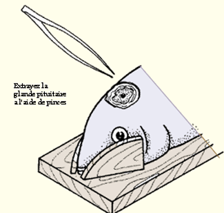 Utilisation d'extraits de glande hypophyse7. Si vous souhaitez utiliser des méthodes de reproduction semi-artificielles ou artificielles, vous devez vous procurer des substances chimiques (ou hormones*) qui jouent un rôle décisif dans l'ovulation, c'est-à-dire la maturité finale des oeufs dormants, Ces substances chimiques, les gonadotropines, sont produites, accumulées et emmagasinées dans la glande pituitaire du poisson, appelée hypophyse*, pendant leur passage au stade de la maturité sexuelle. 8. Cette petite glande pituitaire se trouve dans la partie supérieure de la tête du poisson, sur le côté ventral du cerveau. La collecte de ces glandes prélevées sur des poissons parvenus à maturité ne pose aucune difficulté, de même que leur stockage en vue d'une utilisation ultérieure, si nécessaire, et l'extraction des hormones gonadotropes qu'elles contiennent, comme il sera expliqué ci-après. 9. Il est particulièrement important de recueillir les glandes pituitaires sur des poissons convenablement choisis, pour être sùr que ces glandes contiennent suffisamment de gonadotropines pour être efficaces. Il y a lieu de choisir les poissons présentant les caractéristiques suivantes: