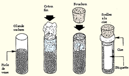 (f) Placez les récipients scellés dans un sac en plastique, ou dans un dessicateur, ou encore dans un récipient étanche à l'air, en présence d'un produit dessicant, par exemple des cristaux de gel de silice ou de chlorure de calcium .
