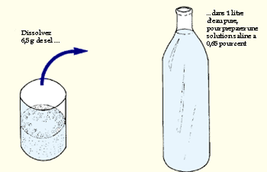 (b) Préparez une solution de sel à 0,65 pour cent (solution saline): dissolvez 6,5 g de sel de cuisine ordinaire dans 1 l d'eau pure, Utilisez soit de l'eau bouillie filtrée, soit de l'eau distillée, Prenez un récipient en verre propre et mélangez soigneusement, Conservez cette solution dans une bouteille obturée au moyen d'un bouchon de liège. (c) Calculez la quantité nécessaire de solution saline d'après les indications des ouvrages cités ci-dessus.