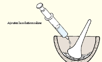 (e) Mesurez le volume prescrit de la solution saline à 0,65 pour cent et versez-la dans le mortier sur la bouillie ou la poudre obtenue. Il est préférable d'utiliser une seringue pour doser convenablement ces petites quantités. Exemple Pour réaliser la premiere série d'injections, mesurez 34 ml + 10 pour cent = 34 ml + 3,4 ml = 37,4 ml de la solution saline préparée au préalable
