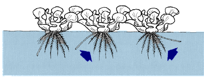 14. Installez cet incubateur en eau peu profonde. Etalez les oeufs fécondés de façon uniforme sur le fond du hapa intérieur. Au moment de l'éclosion, les larves tombent dans le hapa extérieur, laissant derrière elles les coquilles d'oeufs et les oeufs morts dans le hapa intérieur. Retirez celui-ci dès que l'éclosion est terminée. Il convient de limiter l'action prédatrice des oiseaux et des grenouilles en couvrant le dessus de l'incubateur. Note: Cet incubateur est semblable à celui de la page 76. Il peut également être réalisé à partir d'une série de piquets enfoncés dans le fond d'un étang, comme indiqué à la ci-dessous.