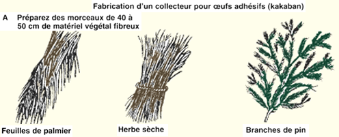 7. Avec les matériaux disponibles sur place, on peut également confectionner soi-même, à moindre frais, un type de collecteur particulier (appelé kakaban en Indonésie). Procédez comme suit. (a) Prenez des matières végétales fibreuses (environ 40 cm de long), telles que des feuilles de palmier, des petites branches de pin ou de longues herbes sèches. (b) Prenez des perches de bambou de 4 à 5 cm de diamètre et d'environ 1,20 m de long. Fendez-les en deux dans le sens de la longueur; faute de bambou, vous pouvez utiliser des piquets en bois. (c) Introduisez le matériel végétal dans les perches de bambou fendues. Fixez-le soigneusement en assemblant solidement les deux moitiés de tiges de bambou. 8. Ces collecteurs sont montés ensemble de façon à former une sorte de radeau que l'on peut installer légèrement au-dessus du fond de l'étang, au moyen de deux longues perches fixées à l'aide de piquets et de cordages. Les collecteurs d'oeufs peuvent aussi être posés sur un bâti léger constitué de piquets, à 20 ou 30 cm audessus du fond de l'étang. Il faut prévoir environ 5 m² de kakaban par kilogramme de géniteurs femelles.