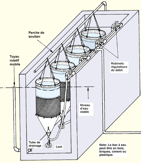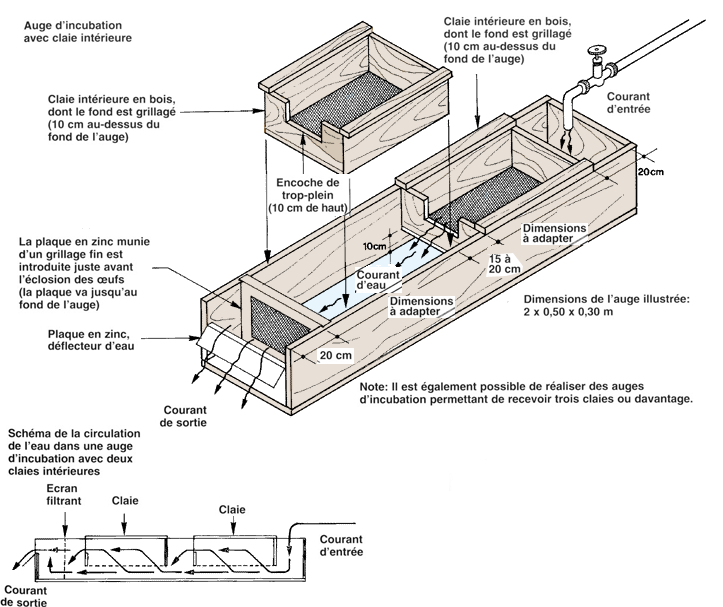 (c) Des auges alimentées par de l'eau courante, qui conviennent aussi aux larves actives, sont semblables à celles décrites ci-dessus (voir section 9.3). En cas d'utilisation pour l'incubation, les claies intérieures sont retirées une fois l'éclosion terminée et les larves sont élevées dans les auges; le débit d'eau doit alors être maintenu à environ 3 à 5 I/min.