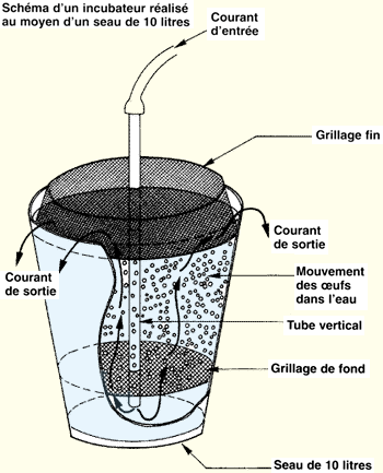 Seaux d'incubation17. Vous pouvez facilement réaliser ce type d'incubateur avec un récipient largement ouvert, par exemple une jarre en terre ou un seau en plastique. (a) Environ 5 cm au-dessus du fond, placez un tamis destiné à retenir les oeufs non adhésifs à l'intérieur du récipient. (b) Fixez à l'intérieur du couvercle du récipient une grille à mailles fines empêchant les larves écloses de s'échapper. (c) Dans l'axe du récipient, fixez un tube vertical (d'environ 1 cm de diamètre intérieur). Il doit dépasser légèrement le tamis du fond. Raccordez-le à sa partie supérieure à l'arrivée d'eau. 18. Les oeufs fécondés sont introduits dans le récipient. Le débit d'eau est réglé de façon que les oeufs restent en suspension et se déplacent très lentement pendant les deux premières phases de développement. Le débit d'eau est légèrement augmenté lorsque les oeufs atteignent le stade embryonné (apparition des yeux).