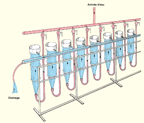 Incubateurs verticaux à entonnoir23. Ces incubateurs sont disposés de façon que l'eau pénètre par le fond, circule verticalement de bas en haut et sorte par la partie supérieure. Le courant d'eau maintient la masse des oeufs en suspension en lui imprimant un léger mouvement continu, sur une partie de la hauteur de la colonne d'eau. 24. Il existe deux principaux types d'incubateurs verticaux, selon la forme de l'entonnoir: