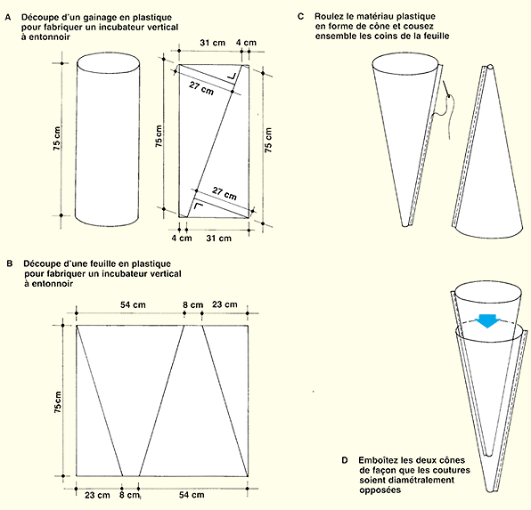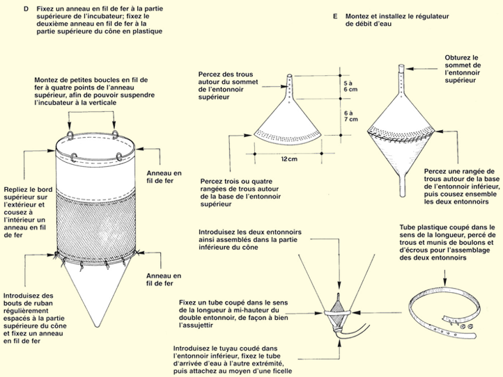 Fabrication d'un incubateur vertical à entonnoir simple, en plastique(Adapté de E. Woynarovich, 1975. Elementary guide Io fish culture ln Nepal, p. 80-81. Rome, FAO.) 28. Vous pouvez réaliser un incubateur vertical à entonnoir simple avec une feuille ou une gaîne de matière plastique résistante. Ci-dessous figure une liste de matériaux permettant de réaliser un incubateur d'une capacité de 8 à 10 l (15 à 16 cm de diamètre).
