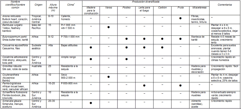 | 1 P = perenne 2 S = semillas; RR = recortes de raices; E = esquejes 3 (no) = posible bajo manejo adecuado |
