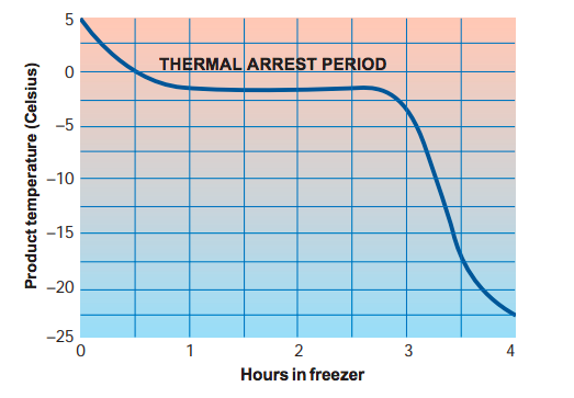 When a fish product is cooled in a freezer, its temperature drops rapidly to about minus 1°C (-1°C), when ice begins to form. However, not all the water in the fish turns to ice at this point. As more heat is extracted, more ice forms, but the temperature of the product drops only slowly until about minus 3°C (-3°C). This period, when the product temperature changes very gradually, is known as the thermal arrest period. The product’s temperature then begins to drop rapidly towards the operating temperature of the freezer.
