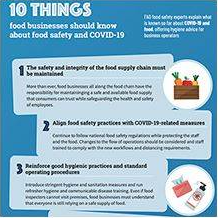 Безопасность пищевых продуктов является одним из элементов Программы ответных мер и восстановления в связи с COVID-19, реализуемой ФАО вместе с партнерами с целью не допустить того, чтобы пандемия привела к коллапсу продовольственных систем, которые являются основой для обеспечения продовольственной безопасности, здоровья и благополучия населения, а также поддержания местной экономики. Несмотря на то что коронавирусная инфекция COVID-19 не передается через пищу, в связи с этой пандемией больше внимания стало уделяться связанным с безопасностью пищевых продуктов вопросам, таким как устойчивость к противомикробным препаратам, зоонозы, изменение климата, фальсификация пищевых продуктов и цифровизация продовольственных систем.