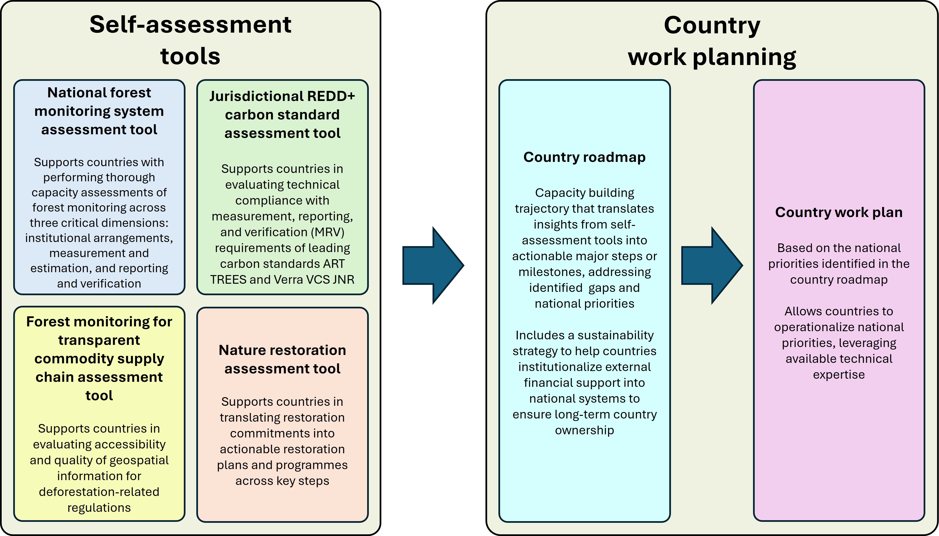 The tool was developed to support countries with performing thorough capacity assessments of forest monitoring across three critical dimensions: institutional arrangements, measurement and estimation, and reporting and verification. The NFMS assessment tool is designed to assist countries in enhancing their forest monitoring efforts.