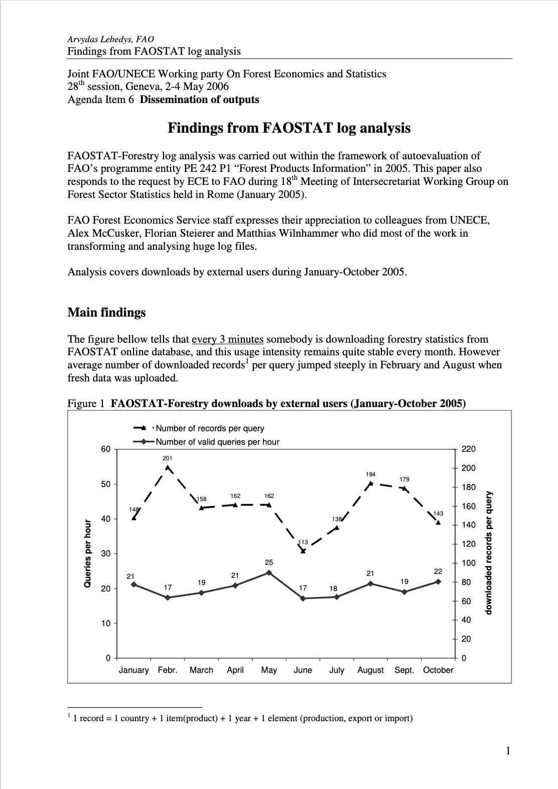 FAOSTAT-Forestry log analysis was carried out within the framework of autoevaluation of FAO’s programme entity PE 242 P1 “Forest Products Information” in 2005. This paper also responds to the request by ECE to FAO during 18th Meeting of Intersecretariat Working Group on Forest Sector Statistics held in Rome (January 2005).