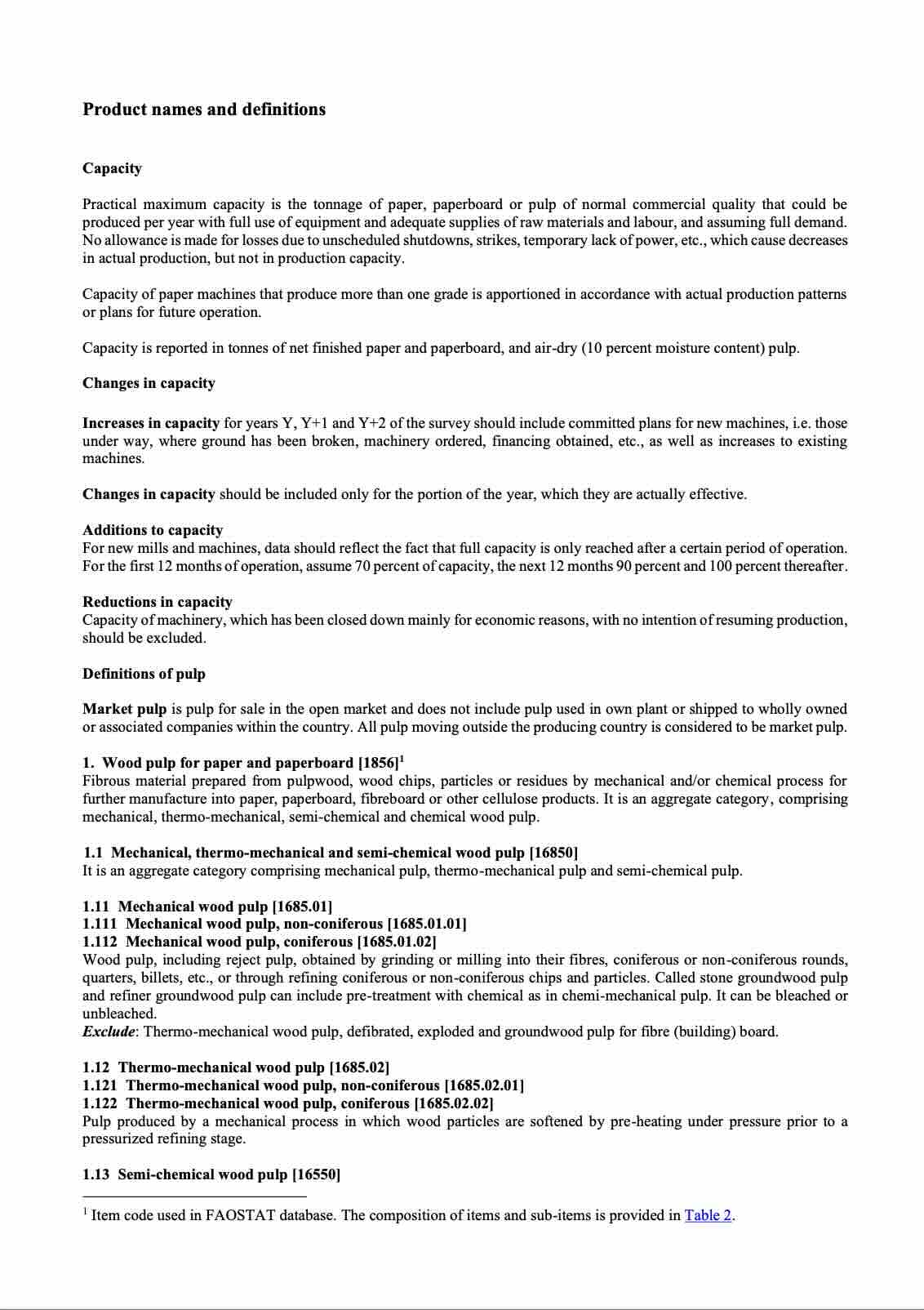 Annual FAO survey of global pulp and paper production capacities based on data received from national correspondents. The publication includes country tables for pulp and paper production capacity; grade tables showing the volume of production capacity by country, for each product and product aggregate code; and production tables by country.