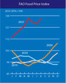 The FAO Food Price Index (FFPI) is a measure of the monthly change in international prices of a basket of food commodities. It consists of the average of five commodity group price indices weighted by the average export shares of each of the groups over 2014-2016. A feature article published in the June 2020 edition of the Food Outlook presents the revision of the base period for the calculation of the FFPI and the expansion of its price coverage, to be introduced from July 2020. A November 2013 article contains technical background on the previous construction of the FFPI.Monthly release dates for 2021: 7 January, 4 February, 4 March, 8 April, 6 May, 3 June, 8 July, 5 August, 2 September, 7 October, 4 November, 2 December.