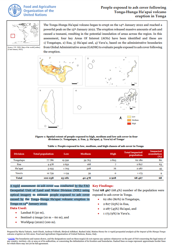A rapid assessment on ash cover was conducted by the FAO Geospatial Unit of Land and Water Division (NSL) using optical imagery to estimate people exposed to ash cover caused by the Tonga-Hunga Ha’apai volcanic eruption in Tonga on 14th January 2022.