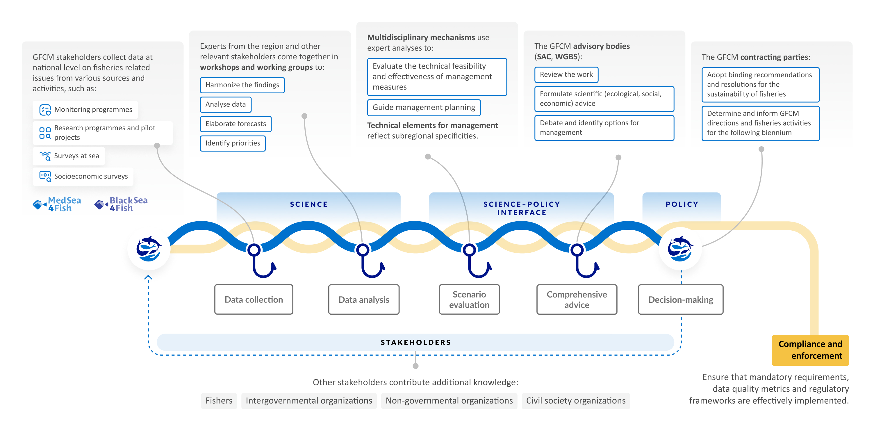 The GFCM adopts an integrated approach towards achieving maximum sustainably yields while ensuring livelihoods and addressing food production.