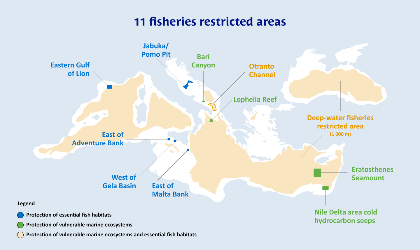 In the GFCM context, a FRA is the area-based management tool used to protect marine ecosystems or sensitive habitats, such as vulnerable marine ecosystems (VMEs), from potentially significant adverse impacts (VME FRAs) and/or enhance the productivity of marine living resources (EFH FRAs), including in the deep sea. Essential fish habitats are defined as being essential to the ecological and biological requirements for critical life history stages of exploited fish species, and these areas may require special protection to improve the status of the stocks and long-term sustainability.