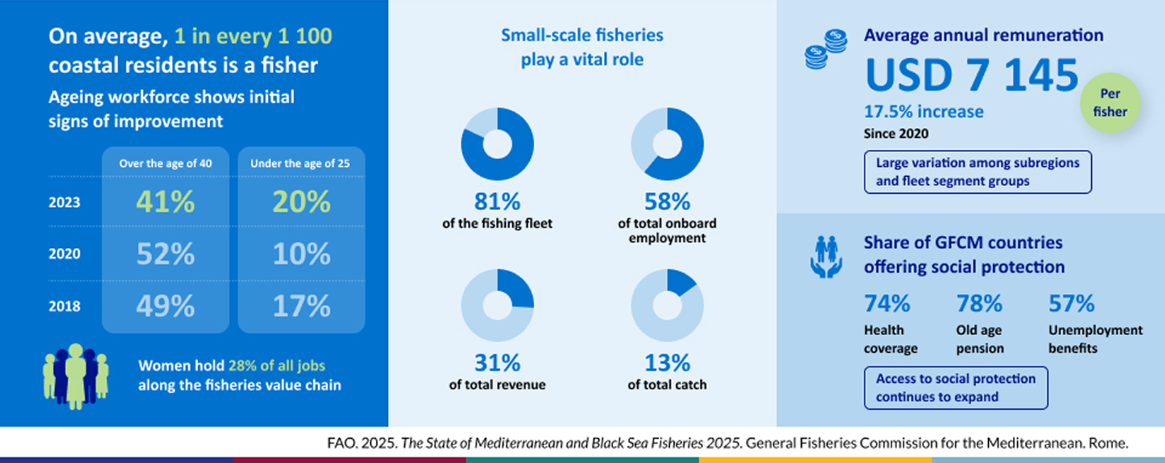 - Small-scale vessels remain the fleet segment group with the oldest workforce (47 percent of fishers are over 40 while only 17 percent are under 25).