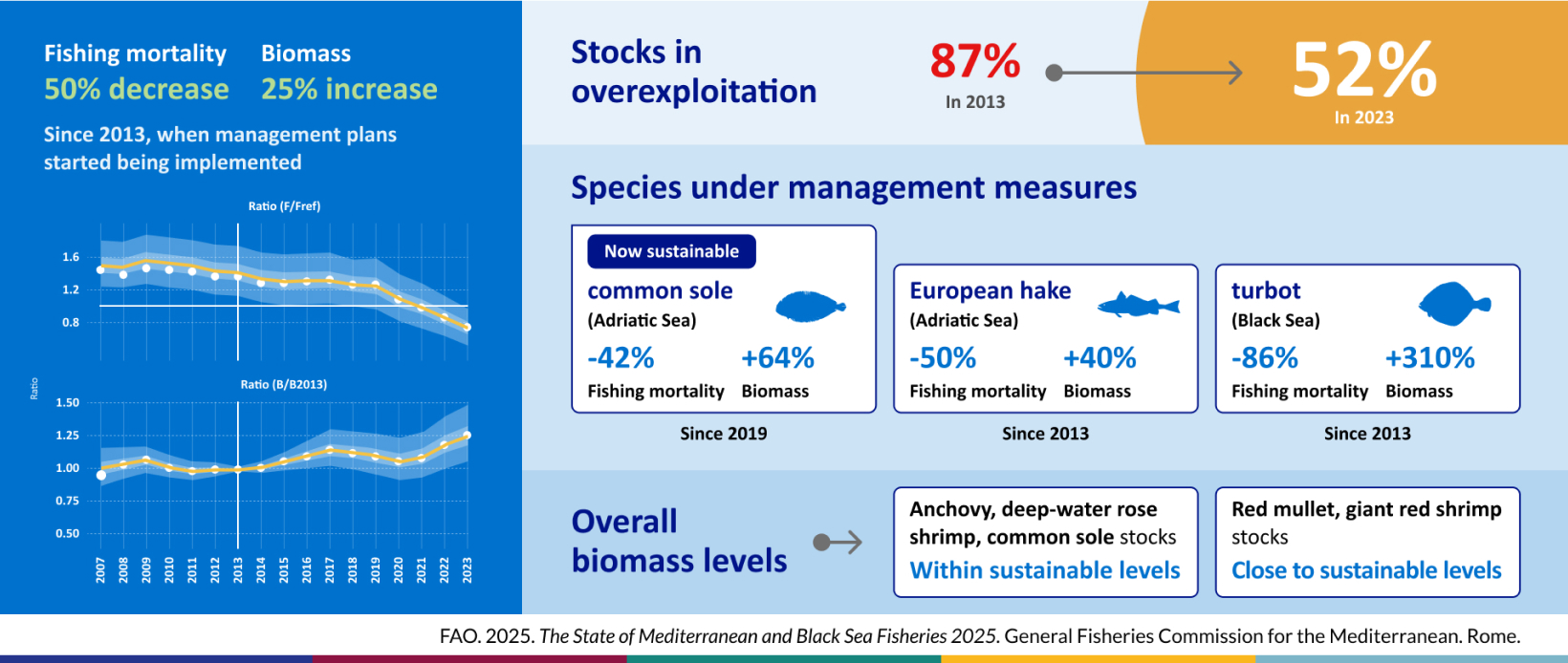 Progress is visible in several key commercial species. Red mullet and giant red shrimp show clear reductions in fishing mortality. Species under specific management plans show a larger than average recovery: common sole in the Adriatic has seen a 42 percent drop in fishing mortality and a 64 percent rise in biomass since 2019; turbot in the Black Sea has shown an 86 percent reduction in fishing mortality and a 310 percent increase in biomass since 2013.