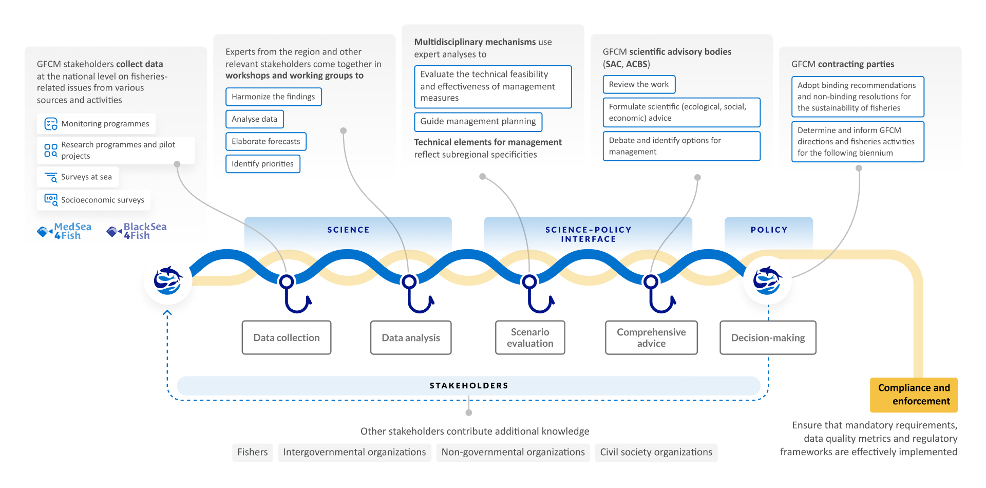 The GFCM adopts an integrated approach towards achieving maximum sustainably yields while ensuring livelihoods and addressing food production.