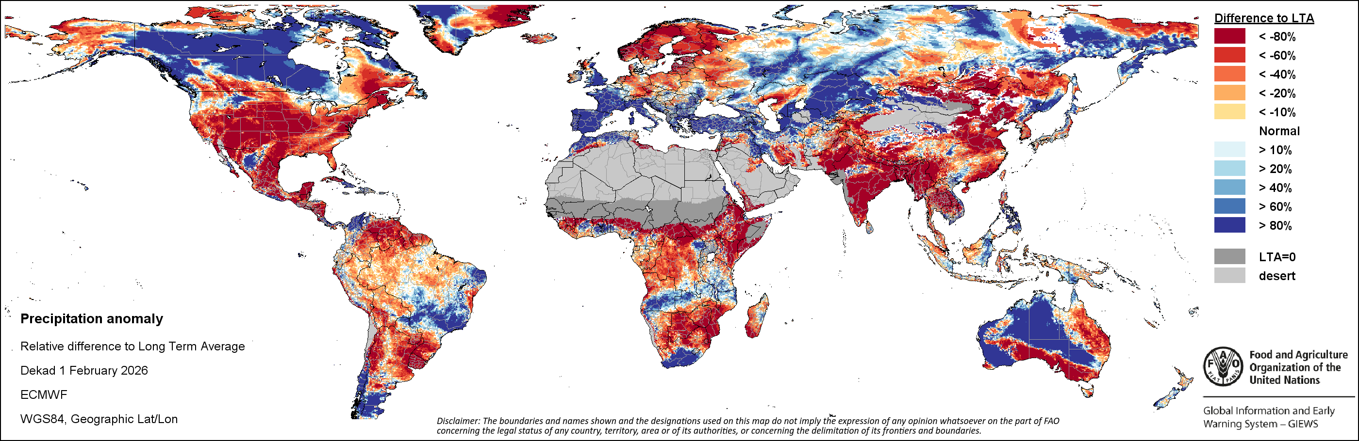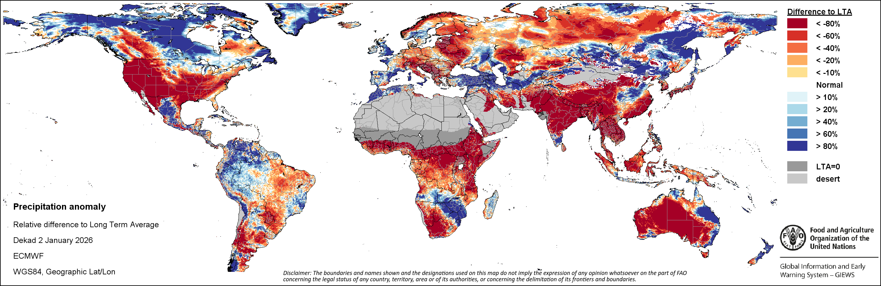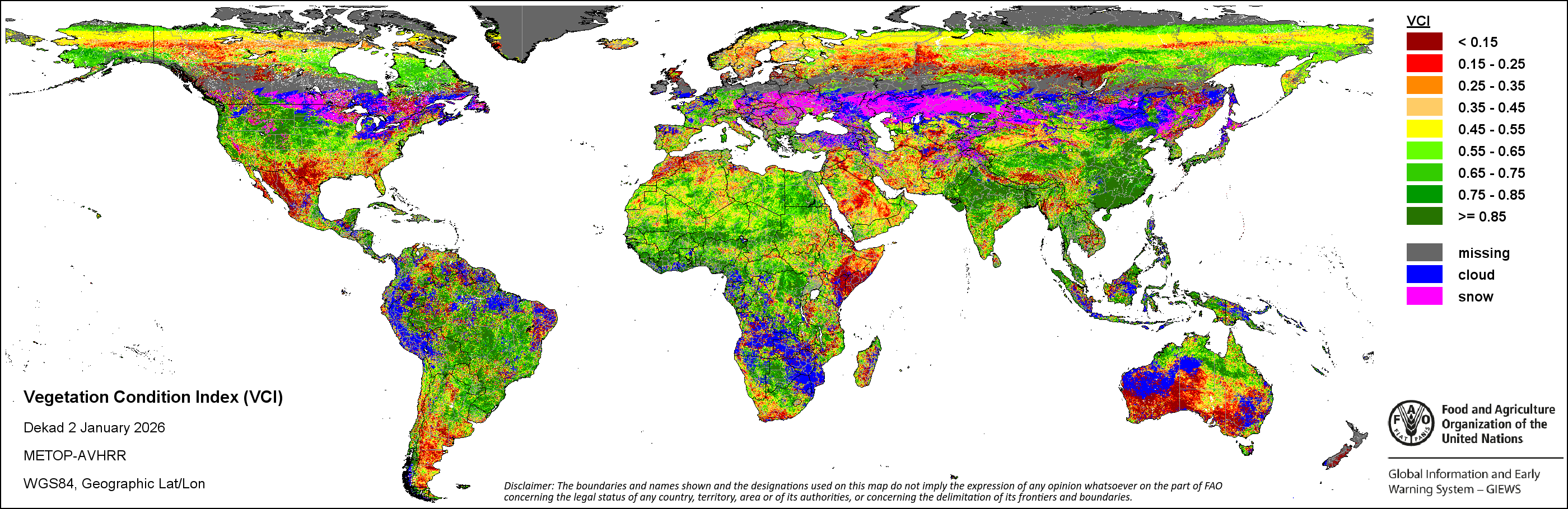 Global Information and Early Warning System on Food and Agriculture (GIEWS) monitors the condition of major foodcrops across the globe to assess production prospects. To support the analysis and supplement ground-based information, GIEWS utilizes remote sensing data that can provide a valuable insight on water availability and vegetation health during the cropping seasons. In addition to rainfall estimates and the Normalized Difference Vegetation Index (NDVI), GIEWS and FAO's OCB Division have developed the Agricultural Stress Index (ASI), a quick-look indicator for the early identification of agricultural areas probably affected by dry spells, or drought in extreme cases.