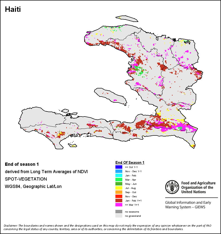 End of Season (EOS) indicates when crop/grass has reached physiological maturity, defined as the date when the descending NDVI-curve crosses NDVIe, This date does not necessarily correspond to the harvest period.