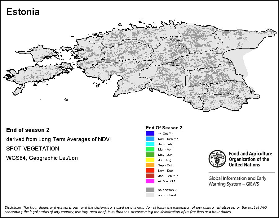 El final del ciclo agrícola (EOS) indica el momento en que los cultivos o el pasto ha alcanzado la madurez fisiológica, definido como la fecha en que la curva descendente del NDVI se cruza con el NDVIe, Esta fecha no se corresponde necesariamente con el periodo de recolección.