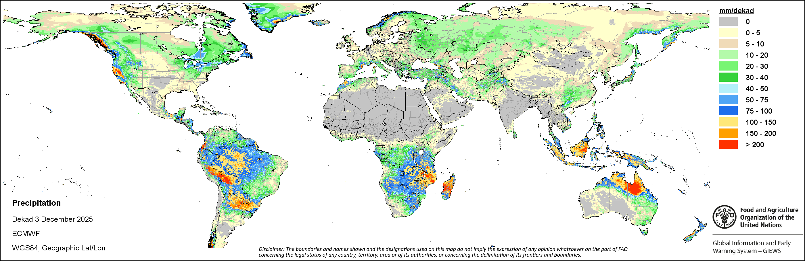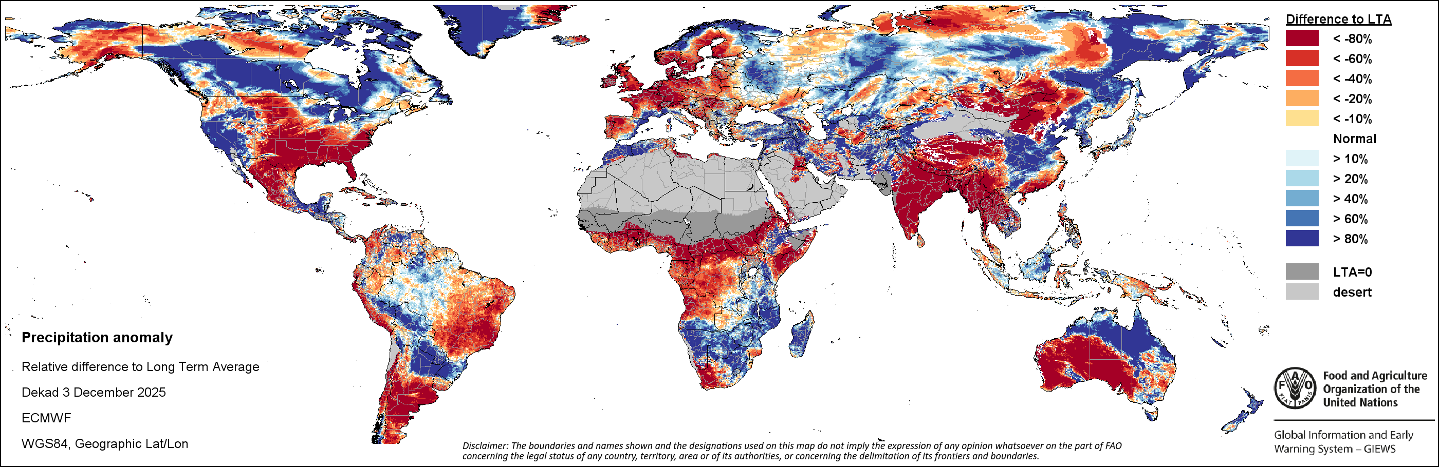 النظام العالمى للاعلام والانذار المبكر عن الأغذية والزراعة (GIEWS) رصد حالة المحاصيل الغذائية الأساسية عبر العالم لتقييم توقعات الإنتاج. دعماً لتحليل المعلومات المستندة إلى الأرض وتكميلها، يعمل النظام العالمي للمعلومات والإنذار المبكر على تسهيل بيانات الاستشعار عن بعد القادرة على توفير رؤية قيمة حول توافر المياه والصحة النباتية خلال المواسم الزراعية. وفضلاً عن إعطاء تقديرات حول الهطولات المطرية و شذوذ المؤشر الموحد لتباين الغطاء النباتي، قام النظام العالمي للمعلومات والإنذار المبكر بالتعاون مع شعبة المناخ والطاقة والحيازة لمنظمة الأغذية والزراعة بتطوير دليل الإجهاد الزراعي، وهو مؤشر من خلال نظرة سريعة لتحديد مبكر للمناطق الزراعية التي قد تكون متضررة بفعل موجات الجفاف أو القحط في الحالات المتطرفة.