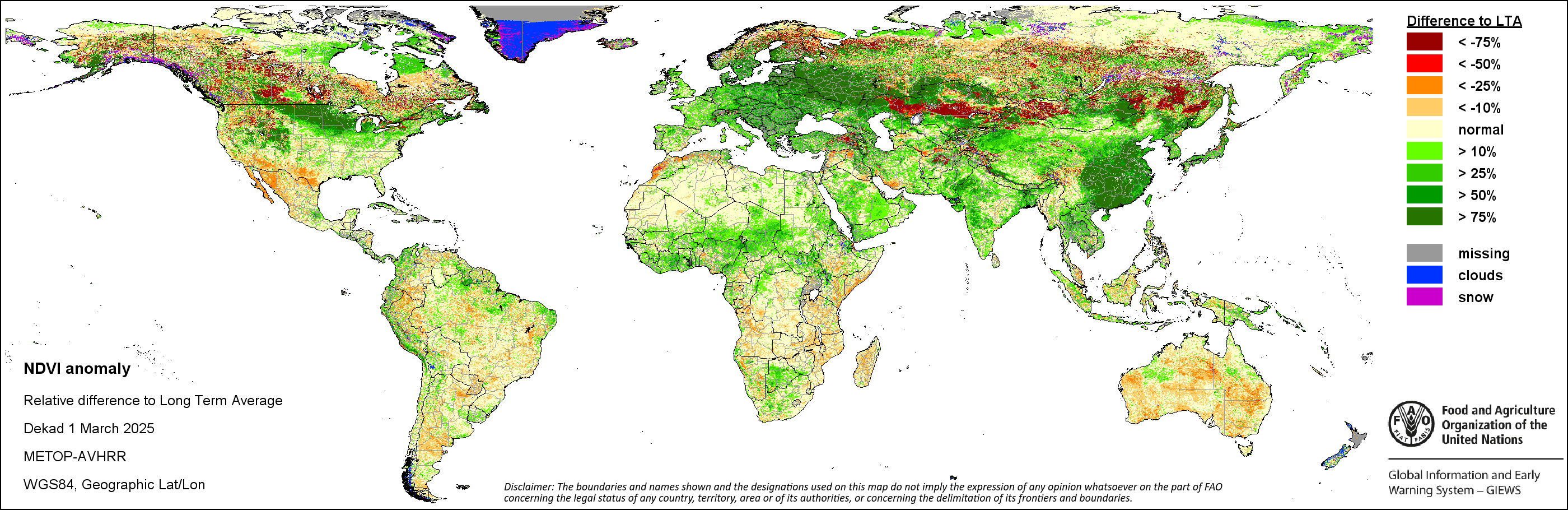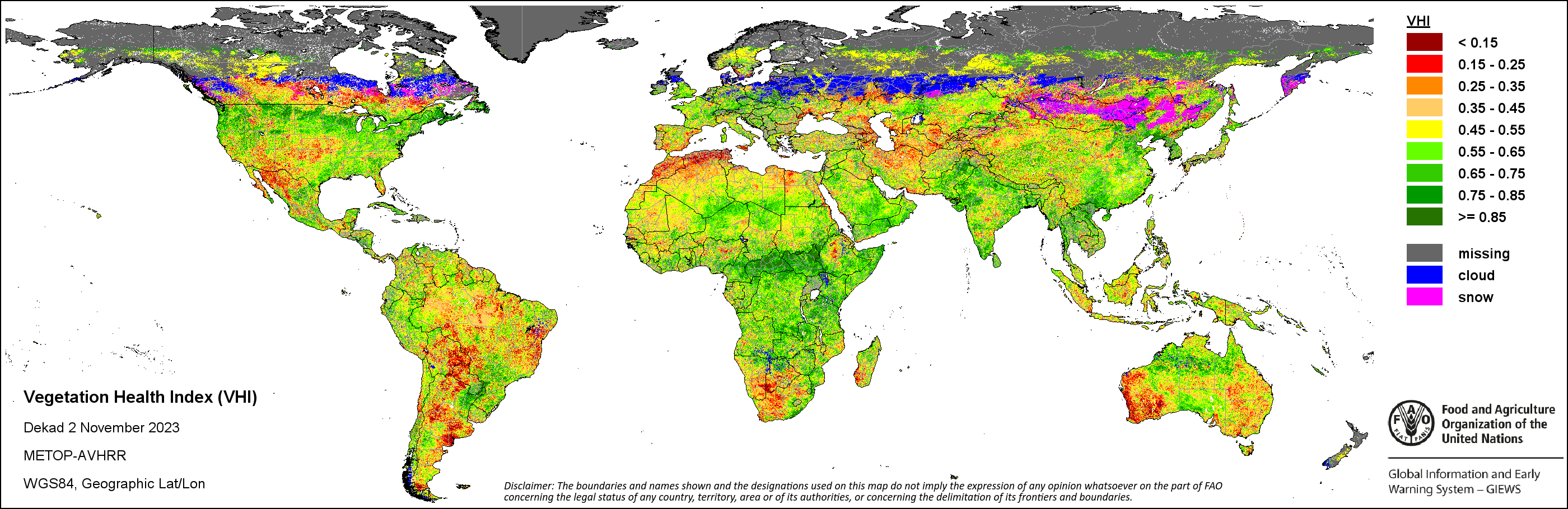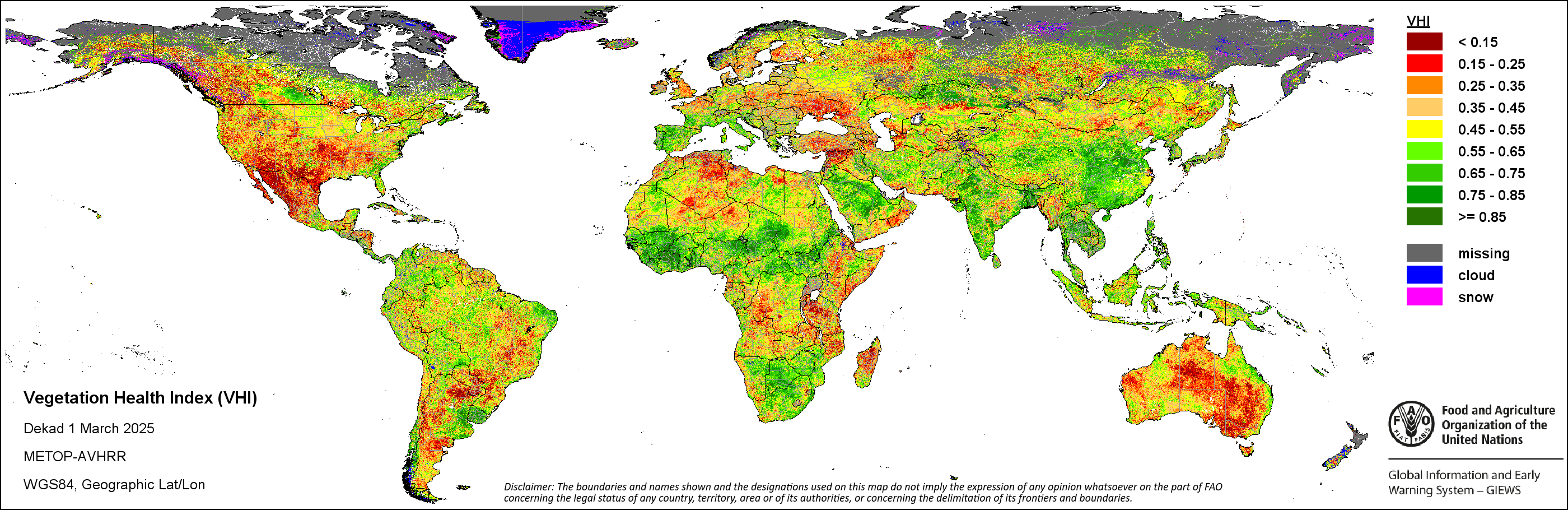 Système mondial d’information et d’alerte rapide sur l’alimentation et l’agriculture (SMIAR) suit l'état de développement des principales cultures vivrières à travers le monde afin d’évaluer les perspectives de production. Pour appuyer l'analyse et compléter les informations recueillies sur le terrain, le SMIAR utilise des données de télédétection en vue de récolter des indications importantes sur la disponibilité en eau et la santé générale de la végétation au cours des campagnes agricoles. Outre les estimations concernant la pluviométrie et l'indice de végétation par différence normalisé (NDVI - Normalized Difference Vegetation Index), le SMIAR et la Division OCB de la FAO ont mis au point l'Indice de stress hydrique (ASI - Agricultural Stress Index), un indicateur qui permet d’identifier rapidement des zones agricoles probablement affectées par des périodes sèches, voire des sécheresses dans les cas extrêmes.