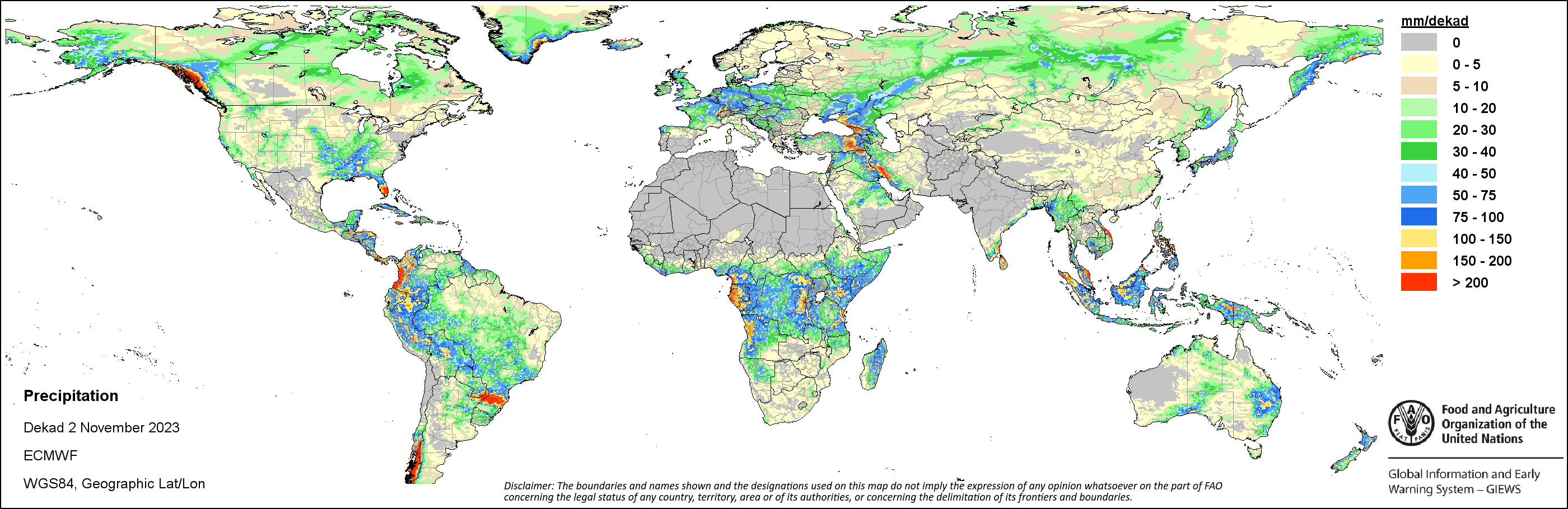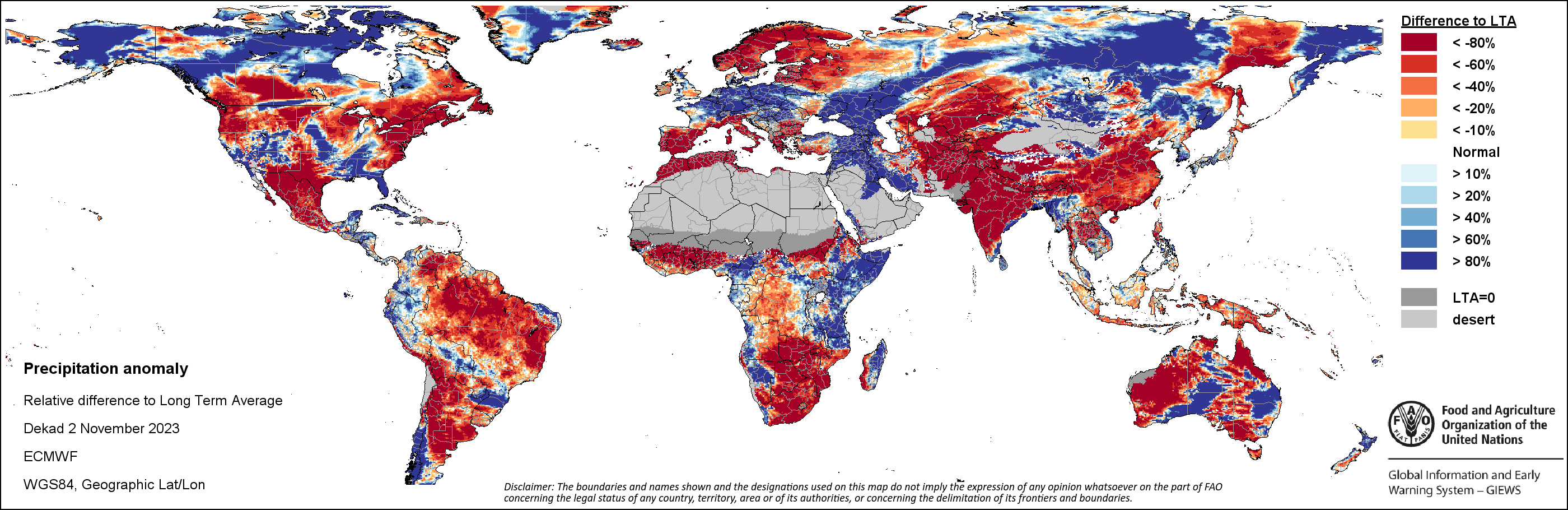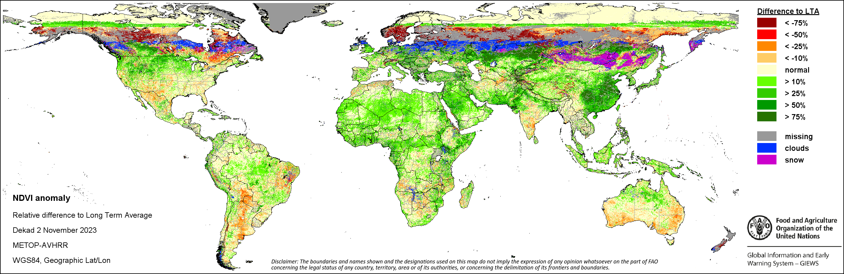 Système mondial d’information et d’alerte rapide sur l’alimentation et l’agriculture (SMIAR) suit l'état de développement des principales cultures vivrières à travers le monde afin d’évaluer les perspectives de production. Pour appuyer l'analyse et compléter les informations recueillies sur le terrain, le SMIAR utilise des données de télédétection en vue de récolter des indications importantes sur la disponibilité en eau et la santé générale de la végétation au cours des campagnes agricoles. Outre les estimations concernant la pluviométrie et l'indice de végétation par différence normalisé (NDVI - Normalized Difference Vegetation Index), le SMIAR et la Division OCB de la FAO ont mis au point l'Indice de stress hydrique (ASI - Agricultural Stress Index), un indicateur qui permet d’identifier rapidement des zones agricoles probablement affectées par des périodes sèches, voire des sécheresses dans les cas extrêmes.