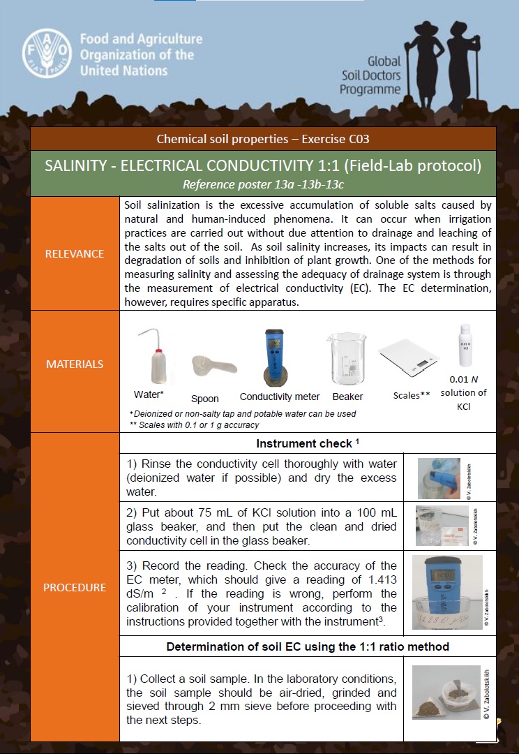 Objective | Understand the importance of soil structure and soil organic matter for regulating water retention and infiltration; provide an overview of the main threats related to salt-affected soils such as nutrient imbalance and soil compaction; illustrate proper sustainable management practices that can reduce or prevent the negative impacts of salinity on soil properties. |