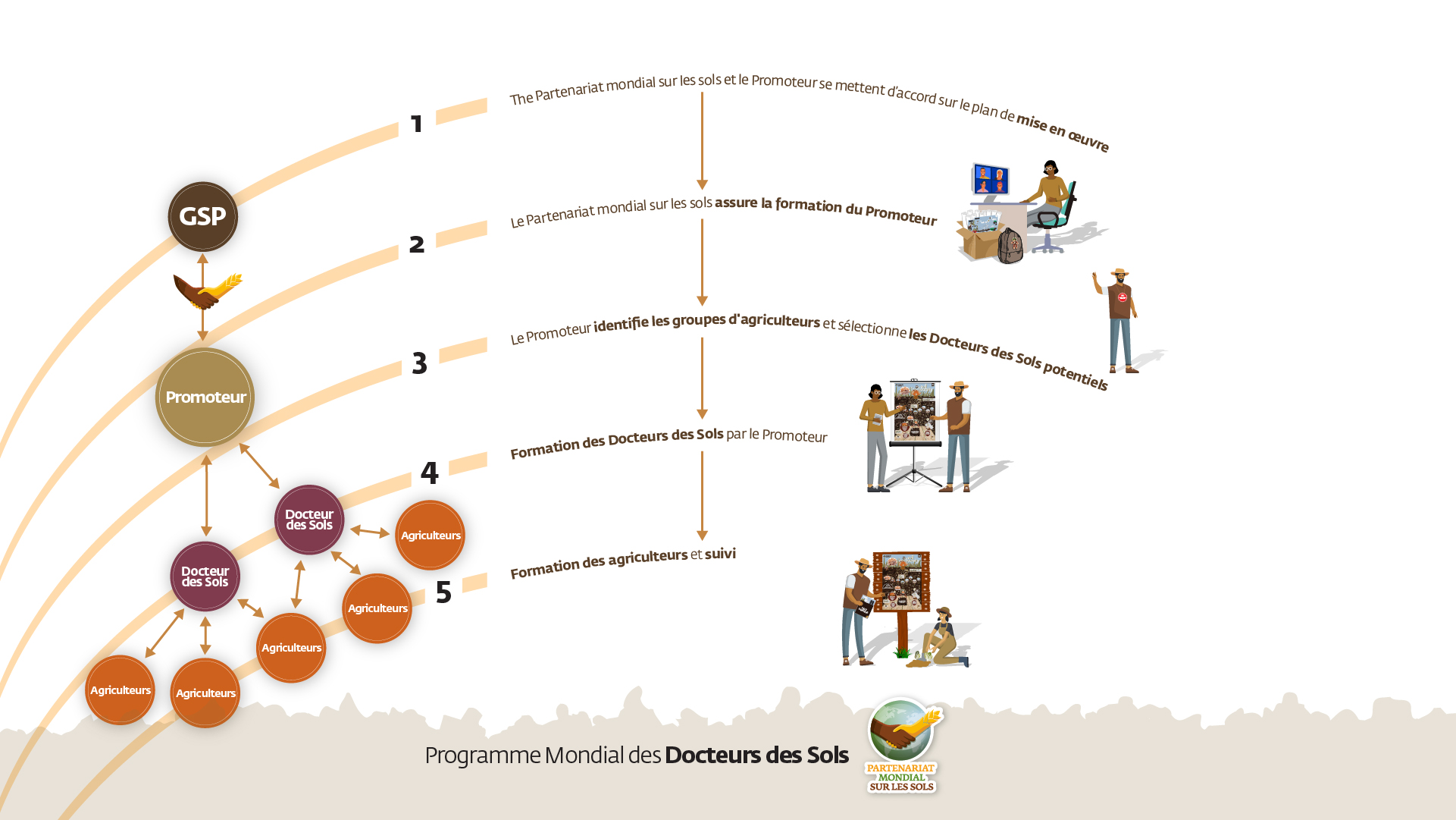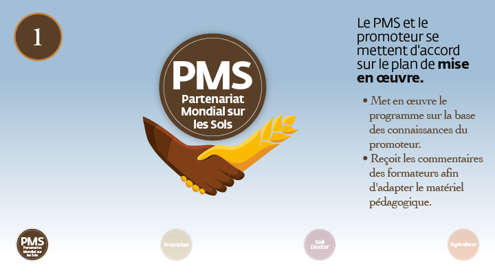 La mise en œuvre du Programme Mondial des Docteurs des Sols au niveau national comporte plusieurs étapes, comme l'illustre la FEUILLE DE ROUTE.