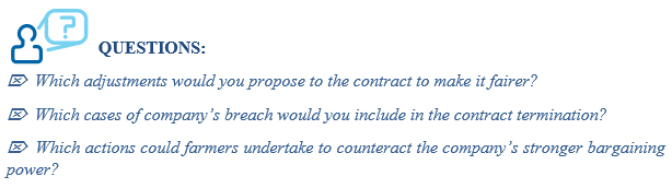 However, this contract is not the best example of a sound and fair contract farming agreement. It rather highlights how power unbalance between farmer and buyer can, sometimes, translate into uneven contractual obligations.