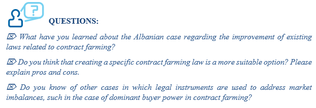 Albania does not have laws specifically covering contract farming. Like in most European Union countries, there are no explicit regulations on formalized, written agricultural contracts in place. Each country is hence free to decide under their national contract law whether the use of written contracts should be implemented on a compulsory basis or not.