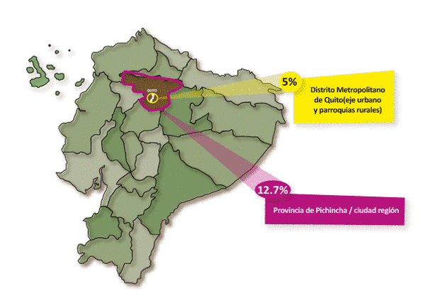 The Province of Pichincha, in which Quito is located, is identified as the most appropriate scale of the city region. The two rings in the image below identify the degree of self-sufficiency consumption of food for the given territory (ring). It compares total food consumption (by weight) of the population in the given territory for specific products with actual production in that area. Consumption figures are based on household consumption data multiplied by population figures. Production data are based on data from agricultural census. The calculation does not account for any food imports or exports, nor for food losses and waste. The second ring was identified as the city region as it includes key production areas, major food processing industry and allows for cross-jurisdictional planning coordination between the city of Quito, surrounding municipalities and the Province.