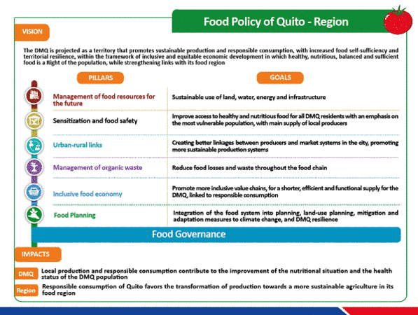 - Integrate food and agriculture into city development planning. This includes the inclusion of local/regional food systems planning in the Quito Vision 2040 development plan, in its Resilience Strategy and in city land use plans.