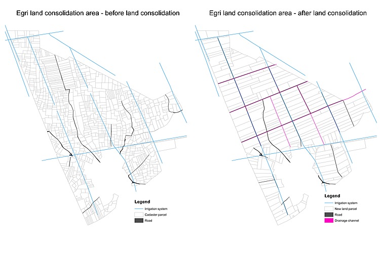 The land re-allotment plan for Egri reduced the number of land parcels by almost fourfold from 874 plots to 260. The 214 landowners now have regularly-shaped parcels that allow for better farming practices.