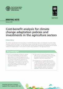 This briefing note illustrates the role and logic of Cost-Benefit Analysis (CBA) in the evaluation of climate change adaptation policies and projects in the agriculture sectors and describes the main analytical steps for conducting it, providing practical examples. The note describes the standard CBA methodology but highlights the peculiarities related to its implementation in the context of climate change adaptation in the agriculture sectors.