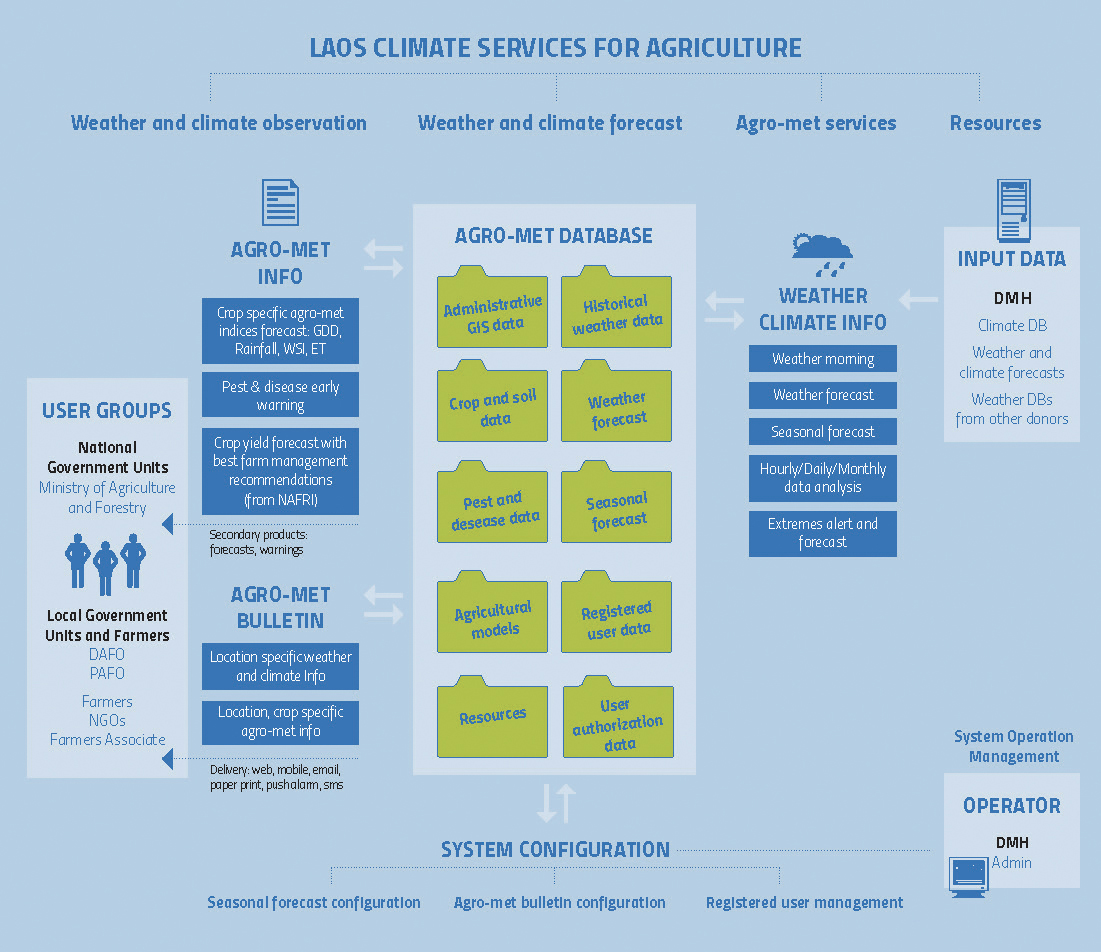 The project will produce the system called Laos Climate Services in Agriculture or LaCSA. LaCSA archives and processes agro-meteorological and climatological data. By means of such data, it interpolates and provides agro-meteorological services to end-users. The system generates and delivers agro-met services to farmers by analyzing the meteorological and agriculture data. It produces seasonal forecast, and seven days bulletins. The seven days bulletin contains weekly weather bulletin, climate smart agriculture recommendations and pest and diseases risk advisory.