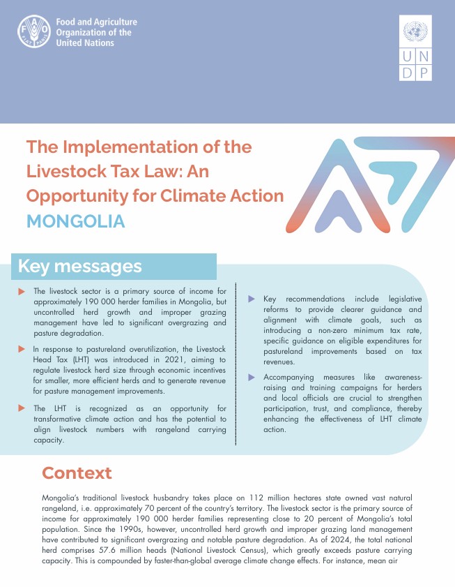 Climate change and increasing livestock pressure are degrading Mongolia’s rangelands, threatening rural livelihoods and food security. Developed under the SCALA programme, this policy brief supports national efforts to strengthen sustainable, resilient and low-emission livestock systems. Read more...