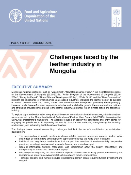 This policy brief, supported by SCALA, analyzes barriers to integrating Mongolia's leather industry into national climate strategies. It identifies challenges like limited private sector engagement, weak incentives, and poor traceability, while calling for more investment in capacity and communication to build a sustainable, climate-resilient sector. Read more...
