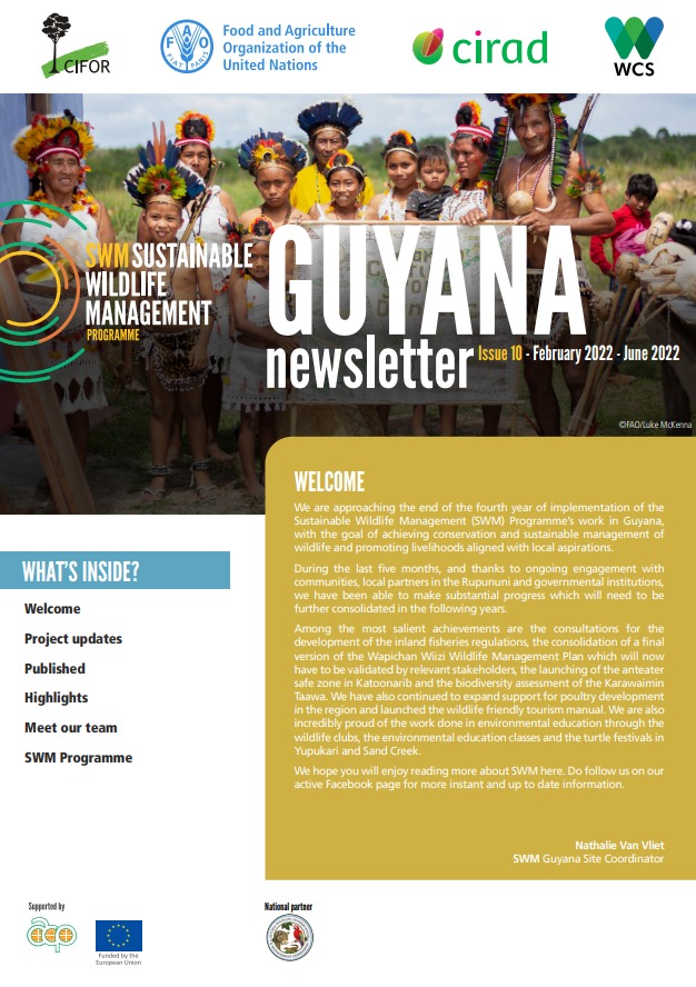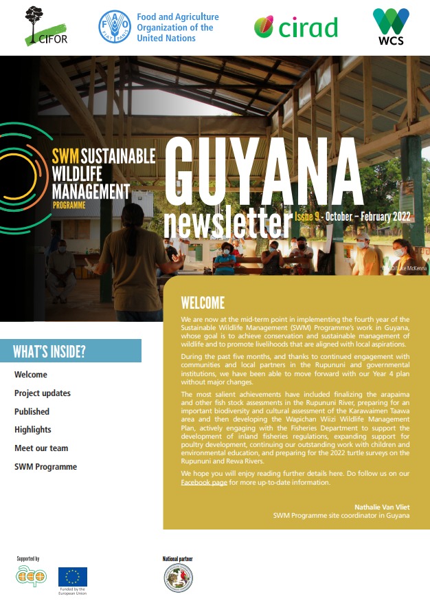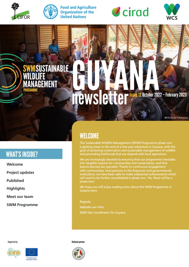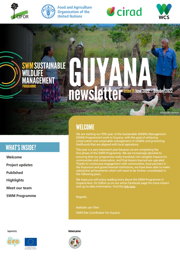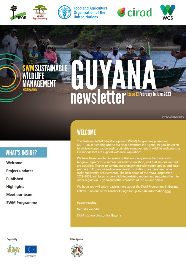 The SWM Programme in Guyana is actively working with 24 communities. Field activities are being implemented by the Guyana Wildlife Conservation and Management Commission, in partnership with six local grass root organisations (South Rupununi Conservation Society, Visit Rupununi, Rupununi Livestock Producers Association, South Rupununi District Council, North Rupununi District Development Board, Caiman House) and in coordination with CIFOR-ICRAF.
