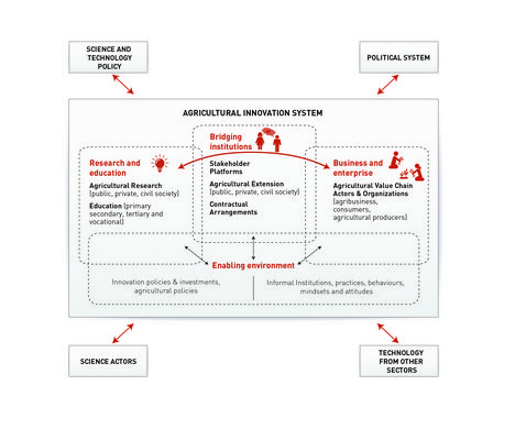 The AIS is comprised of four main components: research and education, business and enterprises, bridging institutions, and the enabling environment.