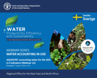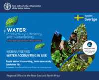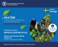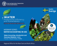 This Webinar Series Part 2 is provided as part of the activities of a project at the FAO Near East and North Africa (NENA) Regional Office called “Implementing the 2030 Agenda for water efficiency/productivity and water sustainability in NENA countries”. This training is the continuation of the Water Accounting (WA) Webinar Series Part 1 that took place in 2019. The target participants are those who produce, analyze, and interpret water accounting outputs. Also, some of the webinars will be useful for decision makers in the field of water resources management and agriculture. Though the contents are designed for stakeholders of the above-mentioned project, this training is open to the public and free of charge for anyone who are interested in the topics. Completion of the Webinar Series Part 1 is not mandatory but is highly recommended as this Webinar Series Part 2 assumes the participants have basic understandings of water accounting -concepts and approaches. The learning goals of this training are to learn Methods/tools/analyses that may be used in water accounting and Water Auditing (water governance assessment) that is implemented alongside water accounting. These materials will be supported with examples of issues/problems that water accounting can inform and case studies of problem-targeted water accounting from different countries. This training consists of 16 webinars presented by speakers from various institutions, online quizzes, and a final training evaluation.