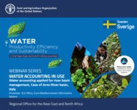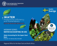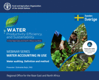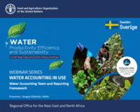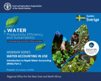 This Webinar Series Part 2 is provided as part of the activities of a project at the FAO Near East and North Africa (NENA) Regional Office called “Implementing the 2030 Agenda for water efficiency/productivity and water sustainability in NENA countries”. This training is the continuation of the Water Accounting (WA) Webinar Series Part 1 that took place in 2019. The target participants are those who produce, analyze, and interpret water accounting outputs. Also, some of the webinars will be useful for decision makers in the field of water resources management and agriculture. Though the contents are designed for stakeholders of the above-mentioned project, this training is open to the public and free of charge for anyone who are interested in the topics. Completion of the Webinar Series Part 1 is not mandatory but is highly recommended as this Webinar Series Part 2 assumes the participants have basic understandings of water accounting -concepts and approaches. The learning goals of this training are to learn Methods/tools/analyses that may be used in water accounting and Water Auditing (water governance assessment) that is implemented alongside water accounting. These materials will be supported with examples of issues/problems that water accounting can inform and case studies of problem-targeted water accounting from different countries. This training consists of 16 webinars presented by speakers from various institutions, online quizzes, and a final training evaluation.