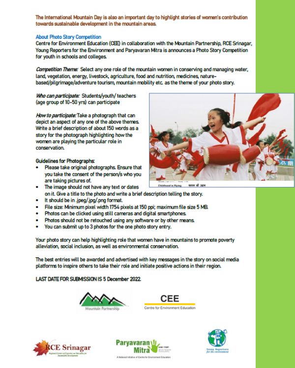 Centre for Environment Education (CEE) in collaboration with the Mountain Partnership, RCE Srinagar, Young Reporters for the Environment and Paryavaran Mitra is announces a Photo Story Competition for youth in schools and colleges.